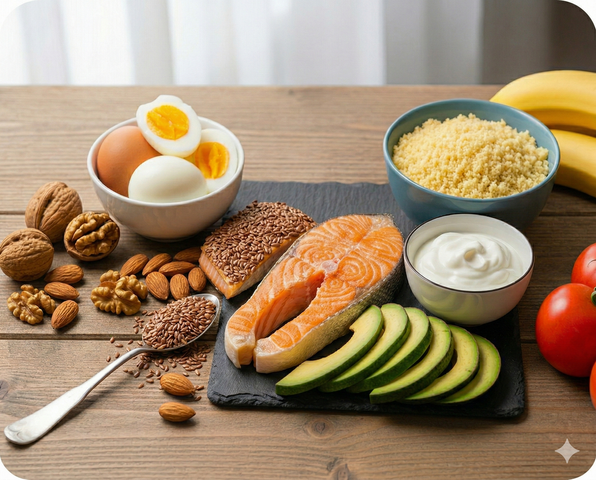 Zařaďte proto do jídelníčku vajíčka, ořechy, lněná semínka, ryby, řecké jogurty a potraviny bohaté na vitamin A a B5. Důležitá je také aminokyselina cystein, která zrychluje růst vlasů a nachází se v potravinách bohatých na proteiny – a také pšeničných otrubách či v kuskusu.