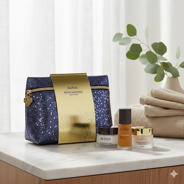 Luxusní dárková sada obsahuje 3 přípravky Ahava a větší třpytivou taštičku, která poslouží jako kabelka či kosmetická etue. Najdete v ní účinné noční sérum s potvrzenými anti-age účinky posiluje přirozenou kožní bariéru a zpomaluje stárnutí pleti. Hydratační pleťový krém zásobuje pleť intenzivní vlhkostí, zatímco multivitaminová maska oživuje matný vzhled pleti už po 5 minutách působení. Receptury obsahují minerály z Mrtvého moře jako magnet přitahují vodu a zvyšují úroveň hydratace v pleti.