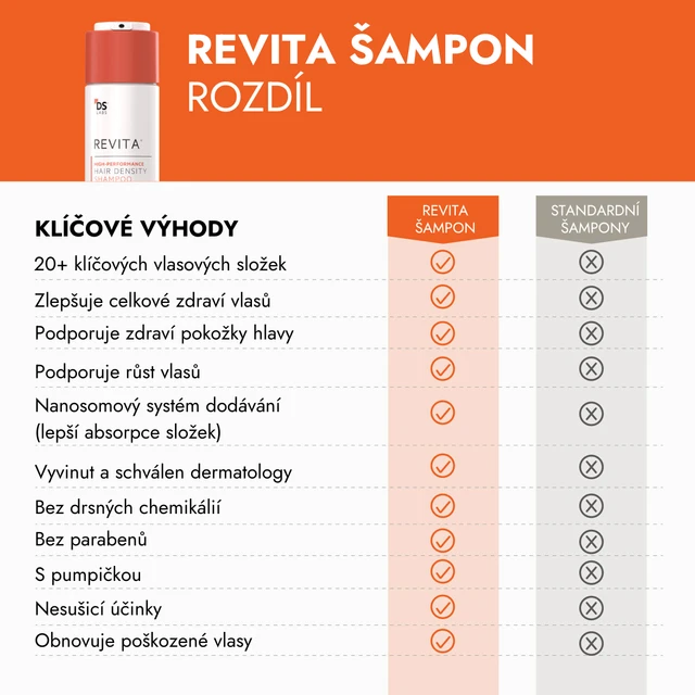 Vypadávání vlasů může způsobit genetika, nezdravá životospráva i stres. Ať už je příčina jakákoliv, vezměte si na pomoc high-tech šampon REVITA. Již během mytí pronikají do vlasové pokožky ingredience, které vlasy posilují a vyživují zevnitř.