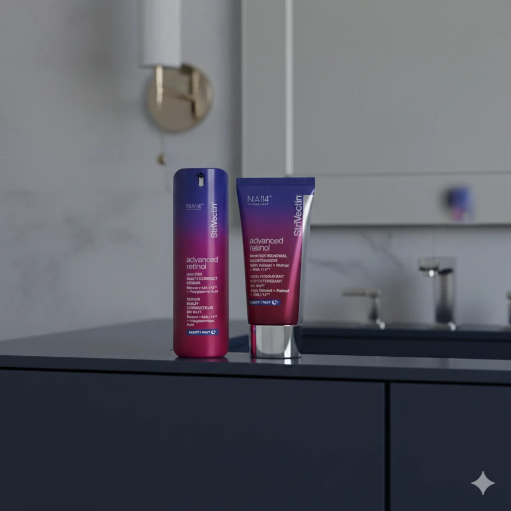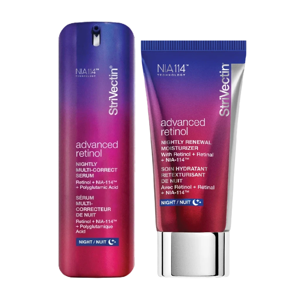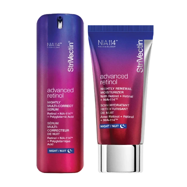 Retinolová sada StriVectin Advanced Retinol kombinuje dva klíčové produkty, které společně cílí na vrásky, ztrátu pevnosti, nerovnoměrnou texturu a unavený vzhled pleti. Pokročilé složení využívá čistý retinol v kombinaci s patentovanou technologií NIA-114, která posiluje kožní bariéru a zvyšuje účinnost aktivních látek bez zbytečného podráždění.