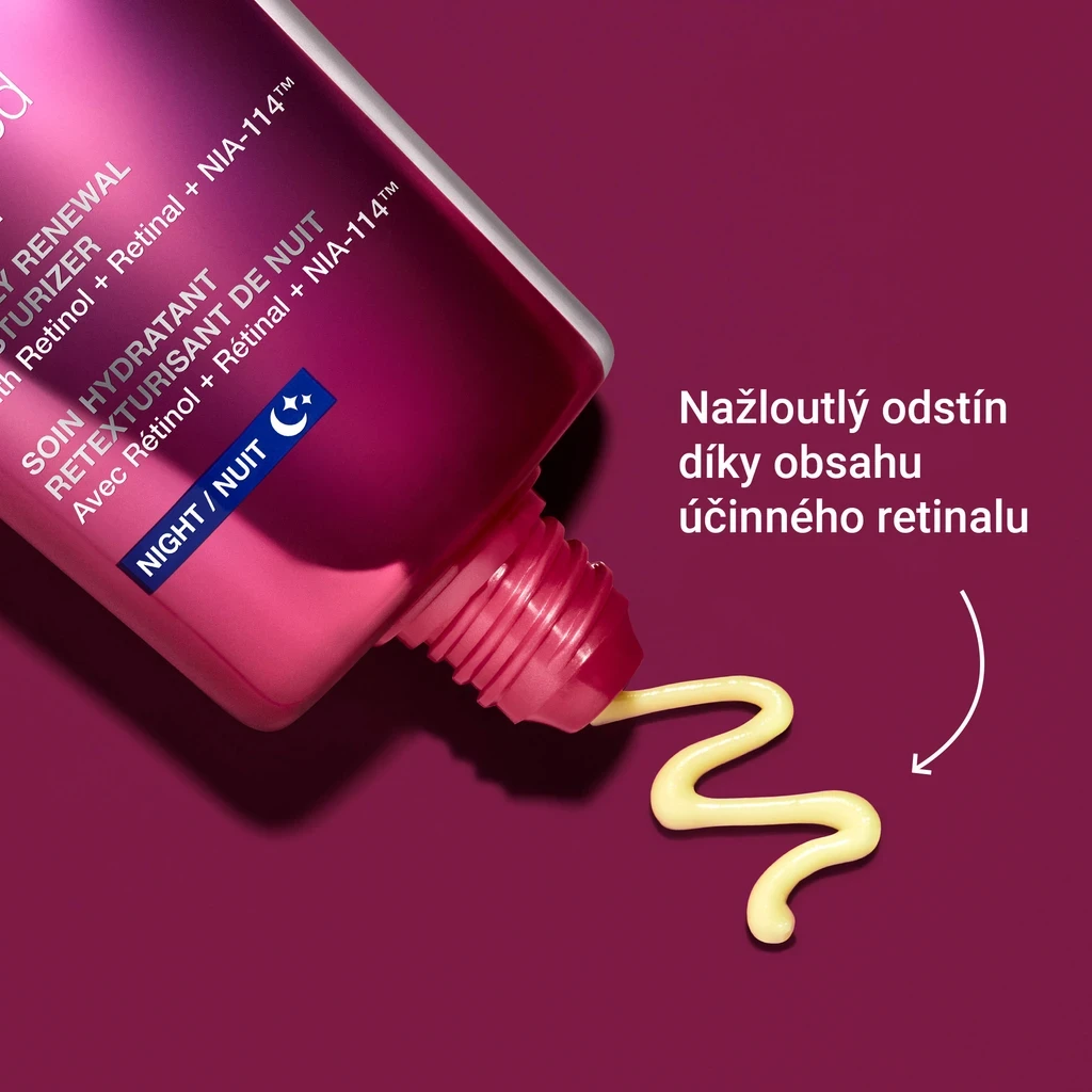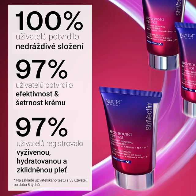 Lehké, účinné sérum, které působí na jemné linie, vrásky, ztrátu pevnosti i nerovnoměrnou strukturu pleti. Díky technologii NIA-114™ je retinol lépe tolerován a výsledky jsou rychlejší a viditelnější – pleť je hladší, pevnější a jasnější. - StriVectin Advanced Retinol Nightly Renewal Cream